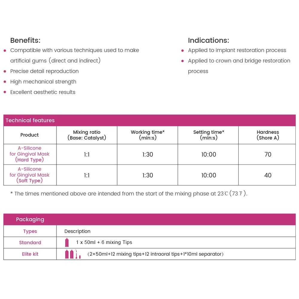 ASilicone for Gingival Mask Hard type offers a 1 min 30 sec working time, 10 min setting time, and 70 Shore A hardness. The packaging includes 1 tube of ASilicone for Gingival Mask (50ml), 6 mixers, and 6 oral tips.